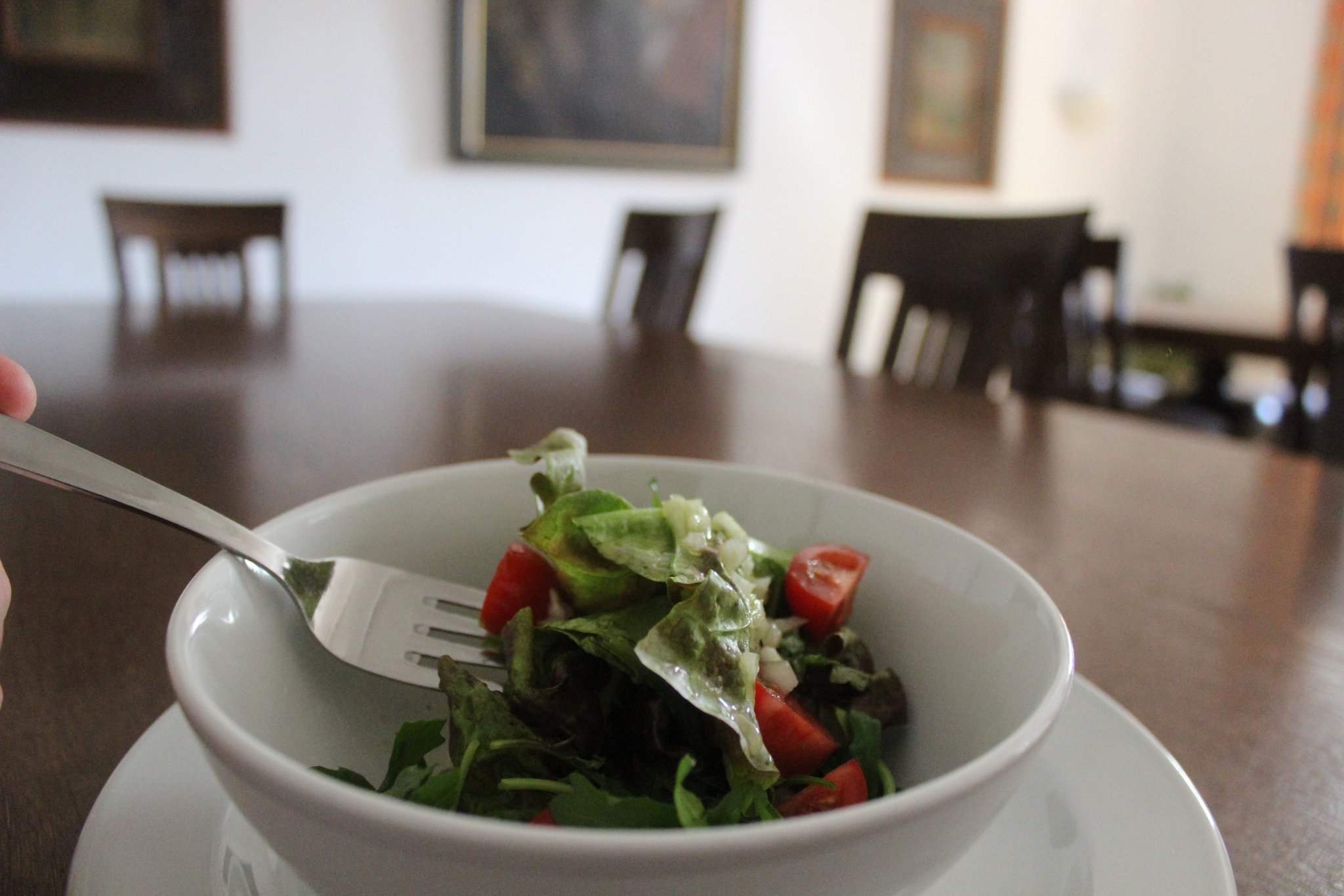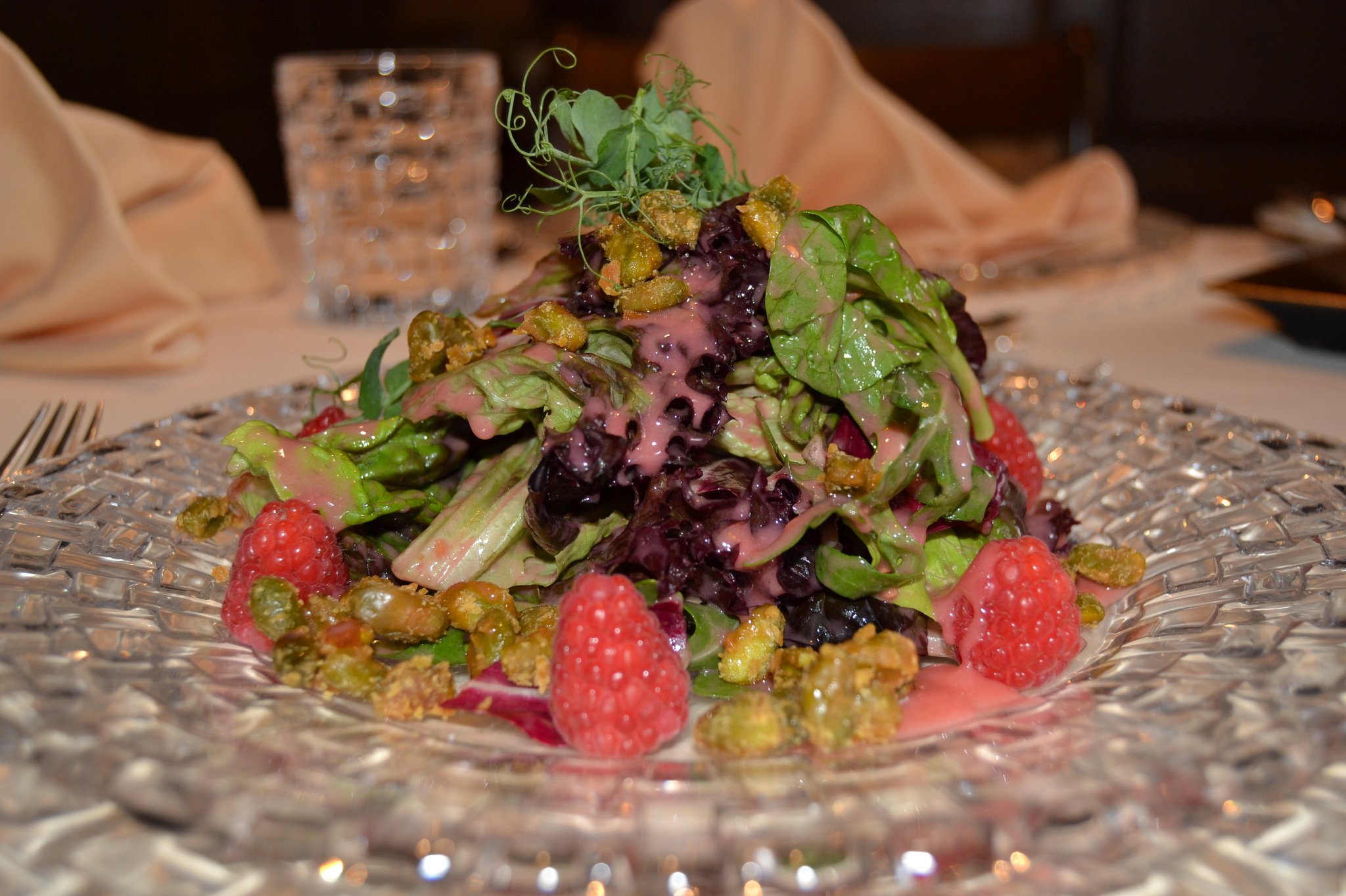 Er serviert als Vorspeise einen gemischten Salat mit Himbeer-Dressing und karamellisierten Pistazien. Weiter