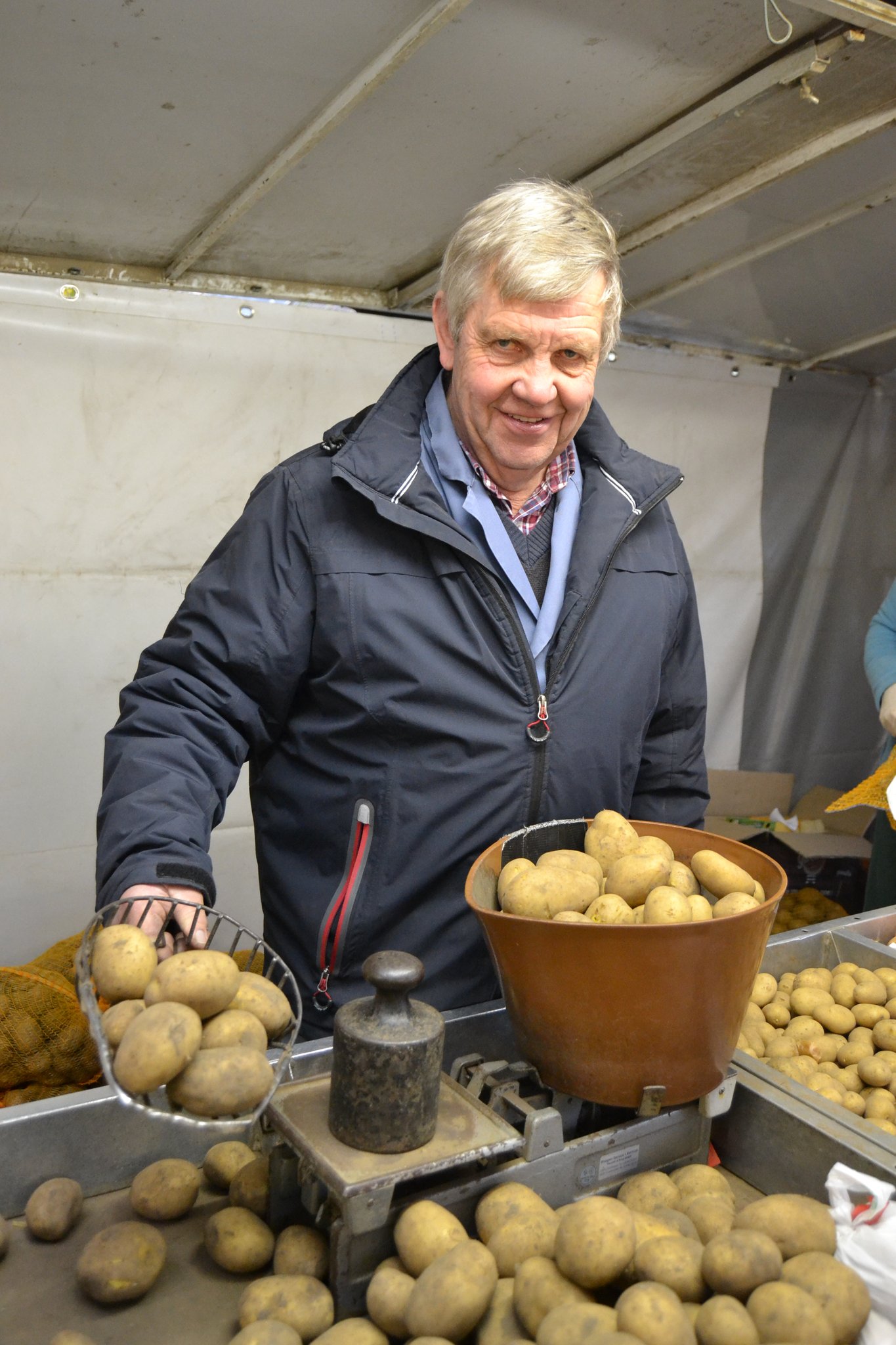 Zielstrebig geht die Familie auf den Gemüsestand zu. Dahinter steht Patrick Sander, der die Wünsche der Große-Wietfelds in Windeseile erfüllt. Ratzfatz packt er in deren mitgebrachte Tasche unter anderem Radieschen, Schnittlauch, Petersilie, Kartoffeln und Knoblauch.