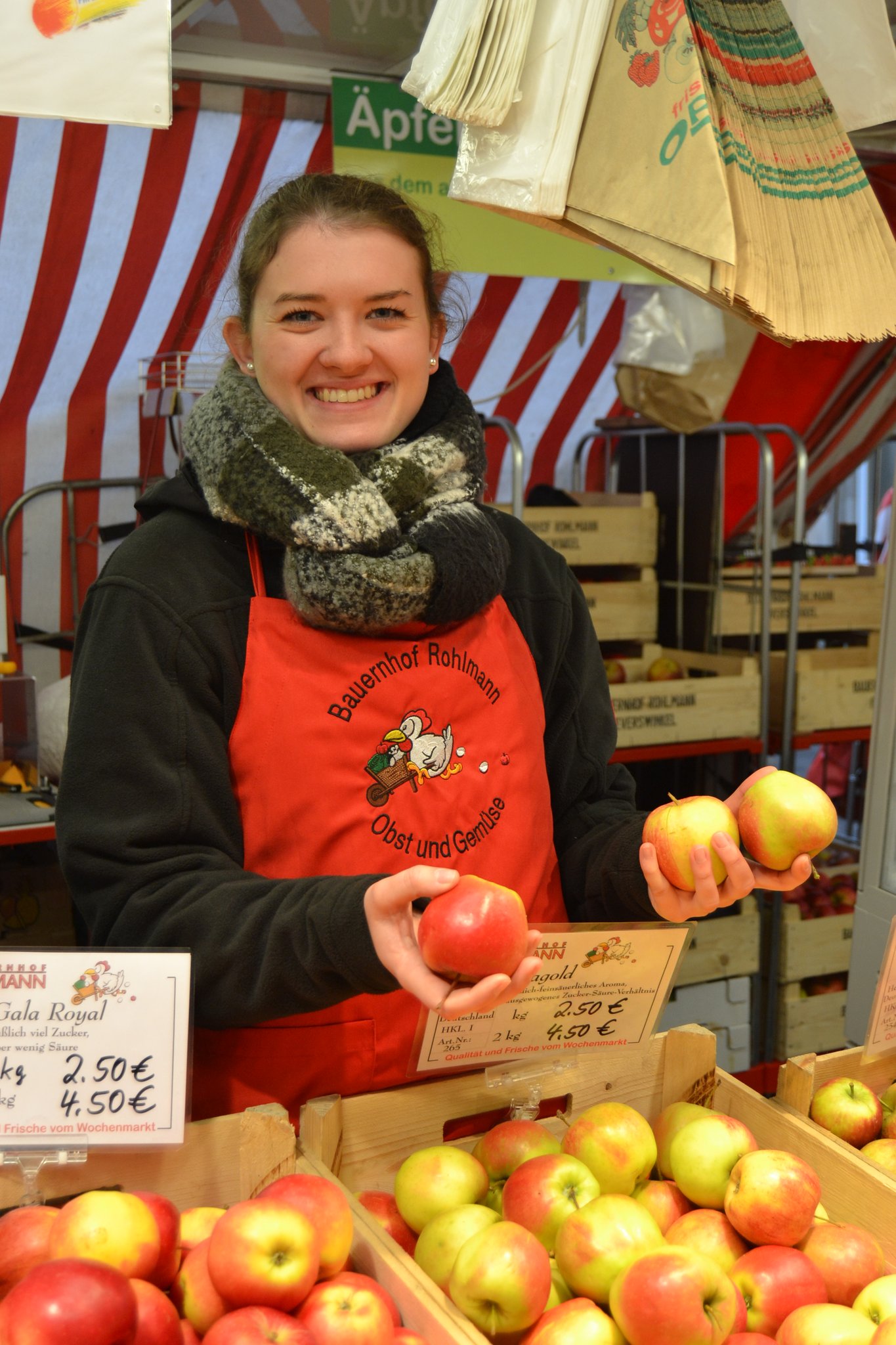 marschiert schnurstracks auf den Stand für Obst und Gemüse zu. „Biolandhof Höner, einer der langjährigen Lebensmittelsponsoren für unsere Suppenküche“, erläutert Haag. Sie schaut kurz auf ihren