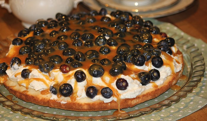 Das flüssige Karamell in Verbindung mit den Beeren ist im Blaubeer-Bananenkuchen ein wahrer Genuss.
