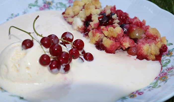 Stachelbeeren, Blaubeeren, Johannisbeeren und Himbeeren gehören in diesen Crumble. Die Teigkrümel werden im Ofen schön kross.