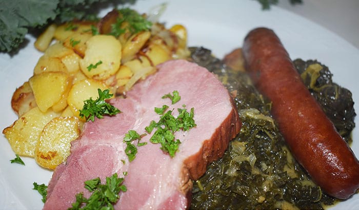 Grünkohl m. Kassler, Mettenden u. Bratkartoffeln