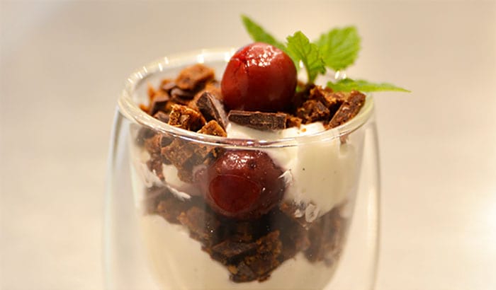 Ein edles Dessert, das ohne viel Aufwand zubereitet ist? Diese Topfenmousse ist perfekt und liefert zugleich winterliche Aromen, indem dazu Zimtkirschen serviert werden.
