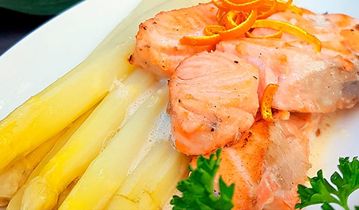 Lachs mit Spargel und süßer Senfsoße