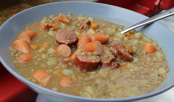 Klassisch im Geschmack und dennoch komplett ohne Fleisch ist dieser vegetarische deftige Linseneintopf. Die klassischen Aromen werden durch Rauchsalz und Zwiebelschmelz erzeugt.