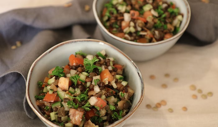 Braune Tellerlinsen und schwarze Belugalinsen bilden die Grundlage dieses Linsensalats. Dazu kommen Tomaten, Gurken, Petersilie und Knoblauch sowie ein feines Dressing.