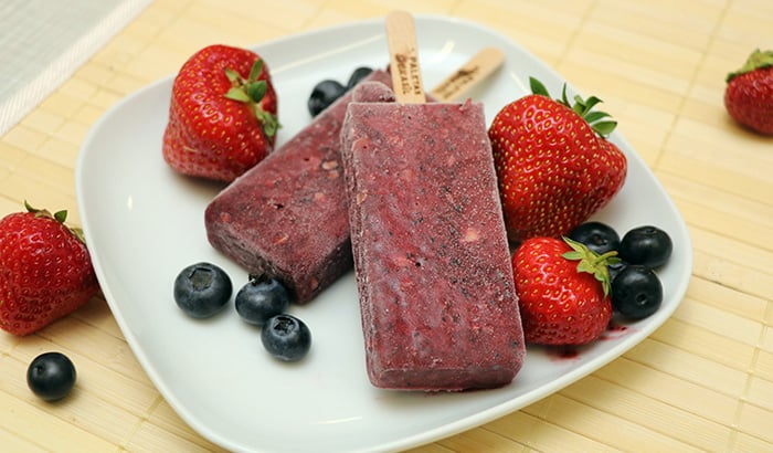 Frisch gepflückte Heidelbeeren und Erdbeeren ummanteln die gerösteten Mandeln in dieser Eiskreation aus Ahlen.