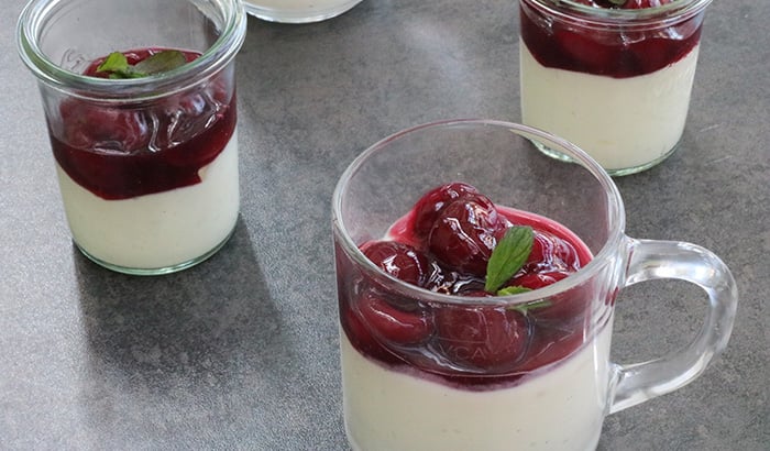 Die Panacotta enthält ein feines Kaffeearoma. Angedickte Kirschen kommen zum Abschluss auf die ausgehärtete Creme.