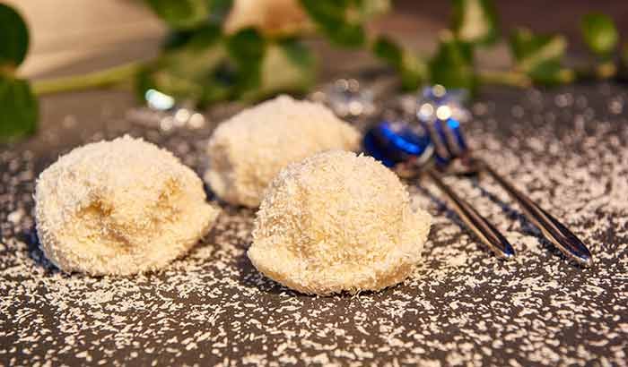 Aus Mürbteig sind diese leckeren Schneebälle geformt. Kokosflocken verleihen ihnen das entsprechende Aussehen.