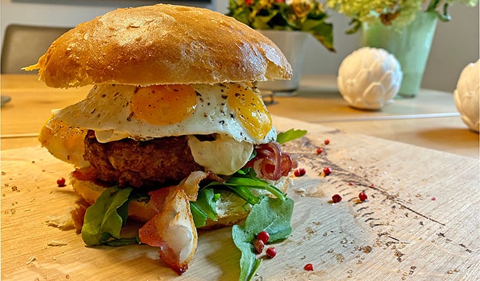 In die Höhe gestapelt wird bei diesem Wildburger. Selbst gemachte Pattys aus Rehhack, Wachteleier, Bacon und geröstete Zwiebeln gesellen sich zu frischem Rucola-Salat.